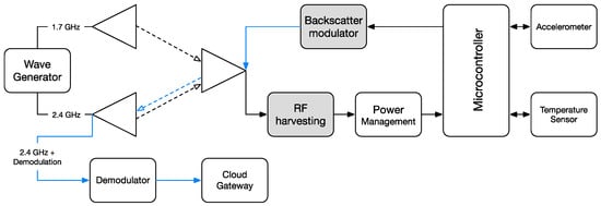 Figure 2 shows a block diagram of the proposed combined technologies. Two main blocks are presented. The first, the RF harvesting circuit, is responsible for converting RF signals into DC energy to supply the microcontroller and modulate the information acquired by the sensors. The modulation is provided by switching the transistor ON and OFF, which is part of the backscatter modulator block. This process is known as Modulated Scattering Technique (MST) [,,,], resulting in this case in an Amplitude Shift Keying (ASK) modulation.