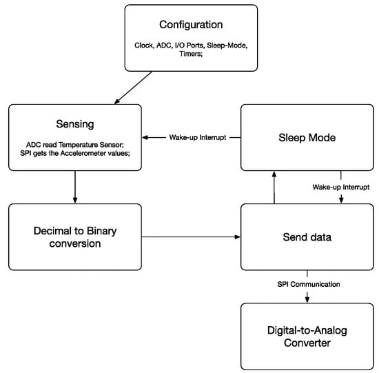 As important as choosing low power components is in the software development, they should also be efficient to ensure that the components are only in active mode when they are actually needed. These techniques allow for a reduction of the system power consumption. The first software operation is the configuration of all of the elements, clocks, I/O ports, timers, ADC, DAC, and sleep modes. After configurations, the software processes the sensing block, reading the temperature and acceleration. The measured data need to be processed since misleading measurement errors can occur. A message is then produced to be delivered to the DAC. At this point, the DAC is responsible for controlling the system impedance by varying the voltage. When the message bit is a zero, the DAC output voltage is 0.0 V, which means that the system is adapted and, consequently, that there is no reflection. By contrast, when the message bit is one, the DAC output voltage is 0.6 V, which means that the impedance of the system is mismatched, which occurs with the reflection of the carrier wave. After sending each bit, the microcontroller enters sleep mode for a short period of time. When it sends the complete message, the microcontroller enters a longer period of sleep. Figure 5 illustrates the process described.