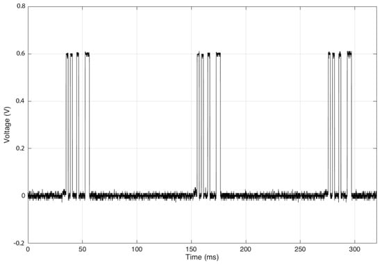 All of the message and sleep periods are defined by a simple variable on the code. The same is done with the output voltage delivered by the DAC. This gives the system the ability to easily modify the parameters for different applications. The message frame is composed of a total of 11 bits—3 bits to identify the tag ID, 2 bits to identify the sensor, 4 bits for the measurement, and 2 bits to detect errors in the message. The following Table 1 exemplifies the message frame with the coding resulting from the measured temperature: