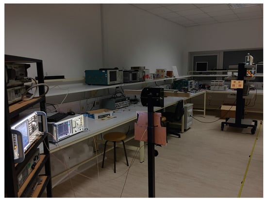 The reader is composed of a Rohde & Schwarz SMW200A Vector Signal Generator to generate two signals at different frequencies, one dual band patch antenna and a Rohde & Schwarz FSP Spectrum Analyzer (Munich, Germany) to analyze the signal modulated and reflected by the tag. The tag has a dual band antenna, a board with an RF-DC circuit, and another board with the processing and sensing elements. The RF-DC circuit and processing sensing elements are not on the same board to allow for specific tests for each approach. Figure 6 shows the measurements setup.