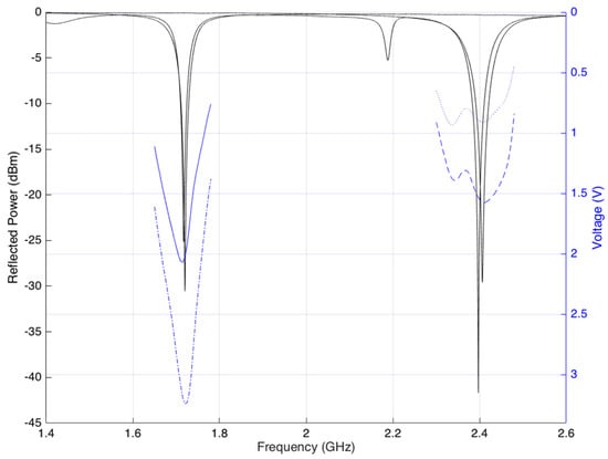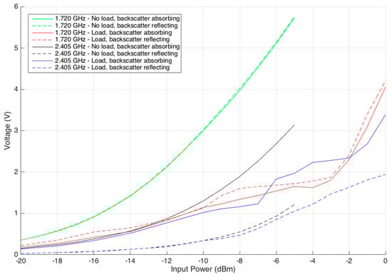 The results are shown in Figure 8. It can be concluded that the frequency that is exclusively used for WPT is not affected by the backscatter absorption or the reflection state. The figure also shows that the wave with 2.405 GHz generates more DC voltage when the system is adapted than when it is not. Another aspect is that there is a decrease of voltage when a load is present. As is known, maintaining the delivered power and increasing the current makes the voltage drop.