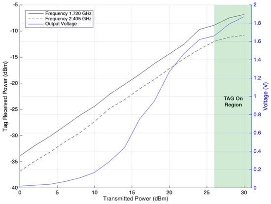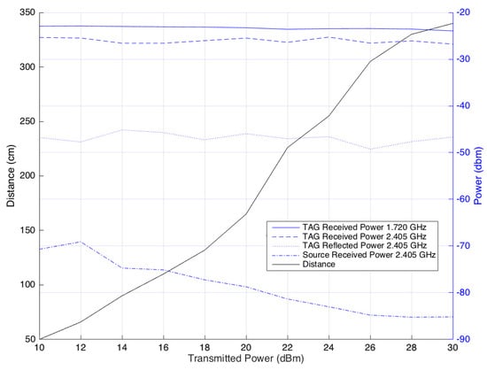 Figure 9 shows that an increment in the transmitted power results in linear growth of the received power for both frequencies until the tag is OFF. The tag turns ON when the transmitted power is near 26 dBm. At this point, the tag starts performing the backscatter process, changing between reflecting and absorbing states. The ON state of the tag is reflected on the receiver power, at 2.405 GHz, where a decrease is visible on the growing line after that point.
