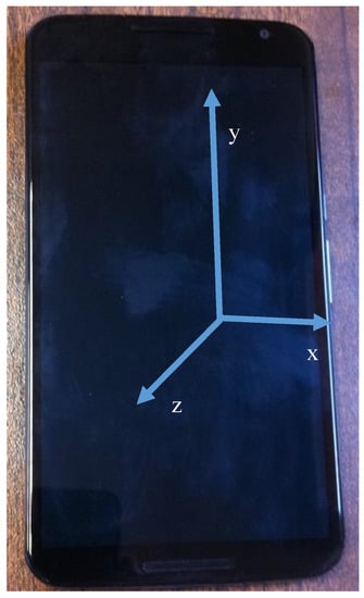 Figure 1 shows the device used to record the raw acceleration data and the three axes as defined by the Android operating system to provide accelerometer and gravity information. The device used was a Nexus 6 Android mobile device, which contains an accelerometer sensor and is able to estimate the gravity force vector using the combination of the accelerometer, gyroscope, and magnetic field sensors. The device is able to obtain 50 samples per second from these two sensors.