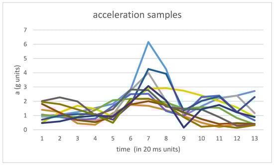 Acceleration samples around outliers corresponding to slow walking steps. Each color represents a different sample.