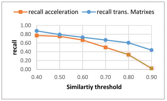 Figure 3 captures a visual comparison for the recall achieved by both methods for different similarity thresholds. Using the transition matrices to characterize the time dependencies improves the results obtained for all of the similarity threshold values. The results do not decay so fast when the threshold moves close to 1.