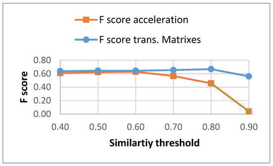 The results for the F-score for the different similarity thresholds for both methods are captured in Figure 4. Using the transition matrices instead of time acceleration segments generates a more constant F-score along the different similarity thresholds (the lost in recall is compensated by a similar gain in precision).