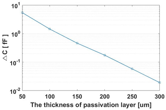 The simulation results are summarized in Table 4. There is no standardized quantitative index for required image quality because the performance differs across sensor systems depending on not only the noise behavior of ADCs and analog front-end (AFE) circuits but also software features such as an image processing and a matching algorithm. However, in capacitive fingerprint sensors, the capacitance variation, ΔC, across sensing pixels is recognized as an effective signal, and ΔCavg can be a useful metric in evaluating the performance of sensing parts when the AFE and ADC circuits are fixed. For example, the matching algorithm in the implemented fingerprint sensor requires ENOB of 3 bits for the ADC when the signal of ΔCavg is applied. In this work, 8-bit, 10-MHz ADCs with the excitation voltage of 3V is used, and ΔCavg larger than 0.02 fF is needed to meet the requirement of 3-bit ENOB. At 2.5 lp/mm, when the thickness of the passivation layer is 300 μm, ΔCavg is improved from 0.003 fF to 0.025 fF by applying the air-wall.
