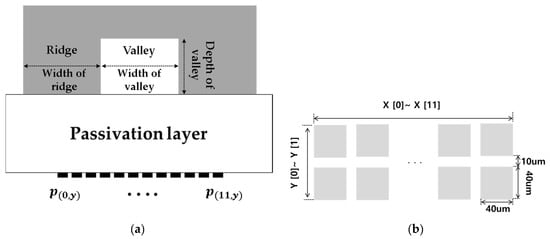 Modeling of a fingerprint, the passivation layer and the array of pixels: (a) Cross-sectional view; (b) Array of pixels.
