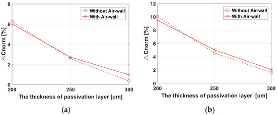 Performance index ΔCnorm vs. thickness of the passivation layer, for the systems with and without an air-wall: (a) Fingerprint pattern frequency of 2.5 lp/mm; (b) Fingerprint pattern frequency of 1.67 lp/mm.