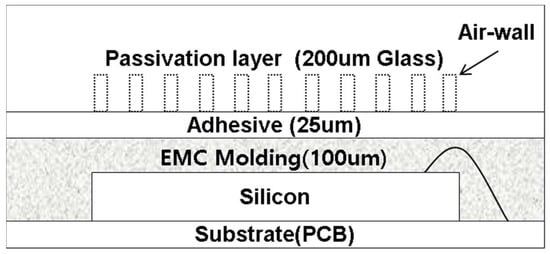 Recently, with the increasing size of mobile payment markets there has been a trend to equip mobile devices with biometrics-based personal authentication services [1,2]. The commonly used biometrics authentication method is fingerprint authentication, which is both convenient and secure. Among a variety of fingerprint sensors such as capacitive, optical, ultrasonic, and thermal sensors, capacitive fingerprint sensors are prevalently used because they are low-cost and can be easily miniaturized. Capacitive fingerprint sensing achieves fingerprint pattern recognition by sensing capacitance changes caused by different distances of the ridge and the valley from the sensor surface [3,4,5,6,7,8,9,10,11]. In addition to the basic recognition performance, mechanical durability must be ensured because sensors are mounted on mobile devices that are exposed to the outside such as a front home button or a rear button. Hence, most of the commercially available capacitive fingerprint sensors have a layer of protective coating on top of an epoxy mold compound (EMC) layer which encapsulates a silicon sensor chip. The thickness of the coating layer is limited to 50–100 µm because of the sensing distance limitation. The coating method has the advantages of high process yield and low unit cost, but the coating is susceptible to scratches owing to insufficient surface hardness. In addition, color reproducibility can be degraded because of the additional coating layer.