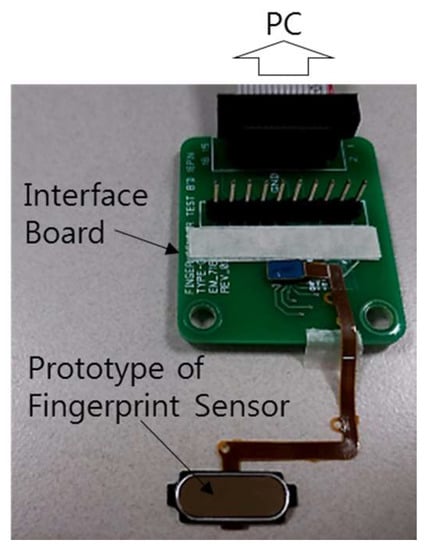 Figure 8 shows a cross-sectional view of the fabricated prototype sensor. The passivation layer was a thin film glass, with a thickness of 200 μm and a relative dielectric constant of 8.1. The air-wall was laser-processed, with a depth of ~50 μm and a pitch of ~50 μm. Below the thin film glass there was a 25 μm-thick adhesive layer with a relative dielectric constant of 3.5. The fingerprint sensor used in the experiment was a self-capacitive type fingerprint sensor, the resolution was 508 dpi, and the package type was EMC encapsulated on silicon with an array of pixels. There was a 100 μm-thick EMC layer between the silicon layer and the adhesive layer, so the total sensing distance was about 325 μm. In addition, a prototype without the air-wall was fabricated for performance comparison. Figure 9 is a picture of the prototype fingerprint sensor and an interface board.