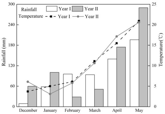 Monthly precipitation (mm) and average air temperature (°C) at the experiment site from December to May in cropping Year I (from 2014 to 2015) and Year II (from 2015 to 2016).