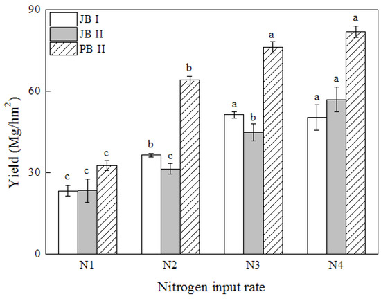 Cabbage yields of JB cultivar in year I (JB I) and II (JB II) and PB cultivar in year II (PB II) response to different chemical fertilizer N application rates. Treatments N1, N2, N3 and N4 received 0, 80, 140, and 200 kg·N·ha−1 in the growth season, respectively. Different letters indicate significantly differences among different N input rates of the same cultivar at the p < 0.05.