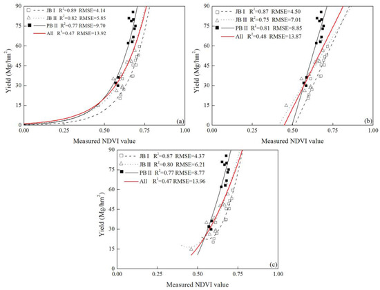 The results summarized in the regression analyses showed that the 110 DAT was the most appropriate time for yield prediction of cabbage. The fitting curves of measured NDVI values and cabbage yield at this stage using exponential, linear and quadratic fitting types are presented in Figure 4. In each growing season, the measured NDVI values could well explain the yield variation and accurately predict in-season yield of JB cultivar in year I and II and PB cultivar in year II, with R2 values ranged from 0.87–0.89, 0.75–0.82 and 0.77–0.81, respectively. However, the result of using one integrated equation to predict in-season yield for both years and cultivars was not satisfactory, since the R2 value was only 0.47–0.48 for the three fitting types, and the RMSE value was between 13.87 and 13.96, suggesting the equations couldn’t make adequate prediction of in-season yield of cabbage cross cultivars and years. As shown in Figure 4, there was a significant deviation of data points from the combined curve. The deviation of JB cultivar in year I and II was much greater than that of the JB and PB cultivar in year II. Thus, the combined fitting curves couldn’t reflect the NDVI-yield response of JB cultivar in different years, which was partly influenced by different weather conditions between years (Figure 1).