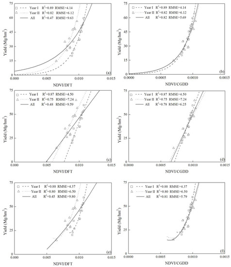Using the DFT and CGDD values to modify the exponential: (a) and (b), linear: (c) and (d), and quadratic: (e) and (f) yield prediction equations, respectively. The data presented in the figure was obtained from the result of JB cultivar in year I and II. The DFT and CGDD values represent the number of days from transplanting to sensing where GDD (growing degree days) > 0) and the cumulative growing degree days from transplanting to sensing, respectively.