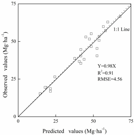 The exponential equation developed from modified NDVI measurements with CGDD values at 110 DAT could explain the in-season yield variation for cabbage satisfactorily, and the integrated yield prediction model for all cultivar-years is shown in Table 3. The combined equation had a high coefficient of determination (0.80) and low RMSE (8.71). To validate the reliability of integrated in-season yield prediction model, we tested the model using an independent data set obtained from validation field planted with JB cultivar in year II near the experiment field. As shown in Figure 6, the predicted yields were highly correlated with the harvested yields (R2 = 0.91) in almost 1:1 relationship with a slope of 0.98. In general, the data points of the validation equation were scattered evenly around the 1:1 line. This confirms the integrated yield prediction model could predict yield of cabbage accurately.