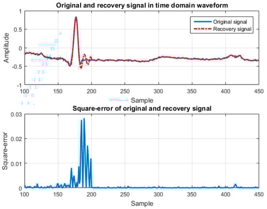Figure 6b presents the squared segment window offset error between the original and recovery signals in order to identify the source of these changes. Low and high symbols of the segment window are compressing regions of the CS and NPC algorithm, respectively. Figure 6 shows the offset segment window, which leads to compression of parts of the QRS signal by the CS algorithm—the square-error increases when QRS region signals are compressed by the CS algorithm. In order to reduce the probability of segment window offset error, we shift the position of the segment window and increase the compressed region of the NPC algorithm. Although this decreases the CR, it effectively improves the SNR. These results confirm that the proposed architecture achieves high performance.