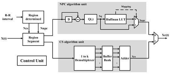 Figure 2 presents the architecture of the adaptive CS/NPC compression algorithm. The architecture of the compressing unit includes two parts: an NPC algorithm and a CS algorithm. The high change region of the original and recovery ECG signal is compressed by the NPC algorithm and the other region is compressed by a CS algorithm. First, the R–R interval is divided into Ncs and Nnpc and the two values are data lengths of the CS region and NPC region, respectively. The input data X(t) is divided into two-part data according to Ncs and Nnpc, and this information is respectively fed into CS and NPC algorithm units to compress the data. The control unit controls multiplexers in architecture to switch signals. A description of the block in proposed architecture is in the following subsection.