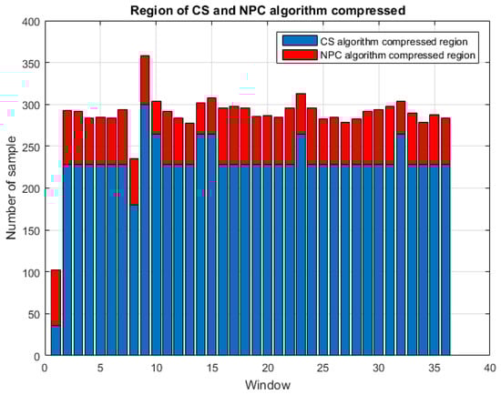 A simple measurement matrix and rapid recovery algorithm were proposed in []. We sought to improve this architecture with the aim of enhancing recovery performance without giving up on a high compression ratio. The proposed architecture is referred to as the adaptive CS/NPC compression algorithm. The region of high square-error proximal to the QRS signal is compressed using the NPC algorithm, whereas other regions are compressed using the CS algorithm. There are only slight changes in the region of low-square error (compressed by CS), which means the compression ratio can be high without compromising recovery performance. Furthermore, we predefine the compressing region distribution of CS and NPC algorithm compression. Figure 4 illustrates the regions that underwent compression using the CS and NPC algorithms, respectively. Most of the signal window (blue region) undergoes high compression using the CS algorithm. The NPC algorithm is used to apply compression in the region of the QRS signal (red region). The compression ratio of the NPC algorithm is lower than that of the CS algorithm; however, the overall compression ratio is high. Algorithm 1 is the proposed algorithm processing method to clarify the description: