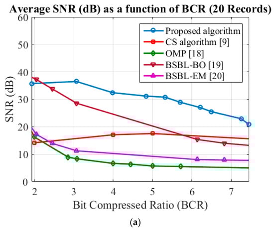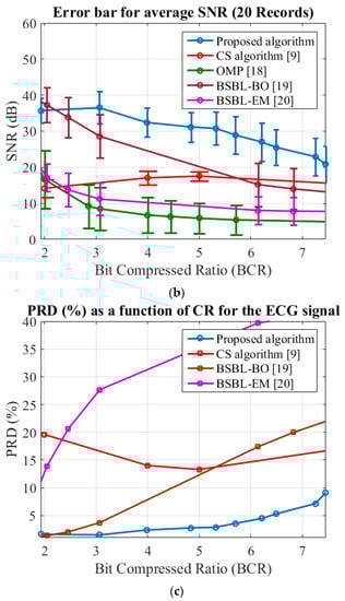 Figure 5 presents the average SNR and PRD values (as a function of CR) when applied to 10 ECG records using various algorithms. Simulations of random 20 records are 100, 101, 111, 112, 113, 114, 115, 116, 117, 118, 119, 121, 103, 122, 123, 124, 212, 220, 230, and 231, respectively. As shown in Figure 5a, the average SNR values obtained using the proposed architecture are better than other algorithms in 20 different records. The error bar for the SNR performance (standard deviation) as shown in Figure 5b presents the deviation of proposed algorithm for the SNR curve is still better than other algorithms in high BCR, and the average PRD is lower than in the CS algorithm proposed by [] as shown in Figure 5c. According to simulation results, the performance of the proposed architecture was better than that of the other algorithms when CR was increased in various records; however, these benefits were observed only when applied to specific ECG records.