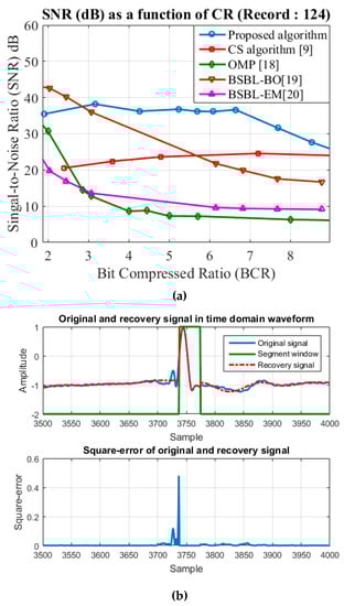 In this section, we discuss the cause of the changes observed in the recovery process. Figure 6a presents an example of comparison of SNR values obtained using various algorithms when applied to a specific ECG record (No. 124). When the CR was lower, the SNR values obtained using the proposed algorithm were higher than those obtained using CS and OMP. Nonetheless, when the CR was increased, the SNR was close to that obtained using the CS algorithm. These results show that the performance of the proposed algorithm is close to that of the CS algorithm in [] when CR is high, which was caused by segment window offset error, as shown in the simulation results in Figure 6. The other probable cause of changes is the location of high-beating waveforms. When the high-beating waveforms are located in non-QRS region, the compressed algorithm utilizing the CS algorithm and SNR gives poorer results when using the CS-compressed algorithm in a high- beating waveform in the proposed architecture. These problems cause a drop in the SNR performance in proposed design and thus further improvements are required in the future.