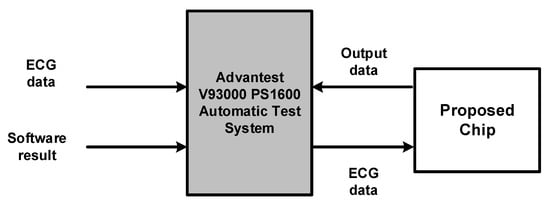 The proposed core was implemented using register-transfer level (RTL) hardware based on the TSMC 0.18-μm standard CMOS technology. Following synthesis using the Synopsys Design Complier, Cadence Encounter digital implementation (EDI) was used for placement and routing (P&R). The chip testing utilizing Advantest V93000 equipment to verify the function is working and its power consumption measurement, as shown in Figure 7.