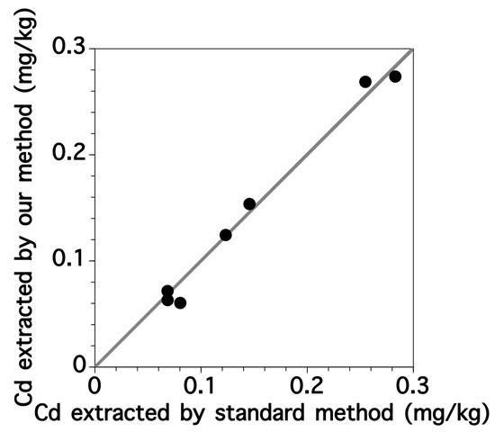 Rice samples (20 g) were ground for 10 s using a laboratory-scale mill (Labo Milser LM-PLUS, Osaka Chemical Co., Ltd., Osaka, Japan). The sample powder was then added to 0.1 M HCl (80 mL) and the mixture stirred at room temperature for 10 min. Following centrifugation at 8000 g for 10 min, the supernatant was filtered through a 1.0-μm-pore-size cellulose ester membrane (A100A047A, Advantec Toyo Kaisha Ltd., Tokyo, Japan) to obtain the extract. The extract solution (9 mL) and concentrated HNO3 (1 mL) were added in 10 mL-test tubes then ICP-OES measurements were conducted. The Cd concentration of the extract determined using ICP-OES was compared with that determined by the standard method to evaluate the extraction efficiency.