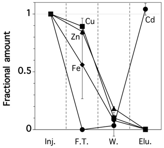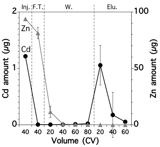 We determined the Cd and Zn contents in each fraction because Zn can strongly inhibit the determination of Cd using BDP-TPY [23]. The flow-through fraction contained most of the Zn (87%) and the first 20 CV of the washout fraction the remaining Zn content (Figure 5). Cd was rarely detected in the flow-through and washout fractions. Most of the Cd was found in the first 20 CV of the elution fraction and the residual Cd was recovered in the later elution fractions.