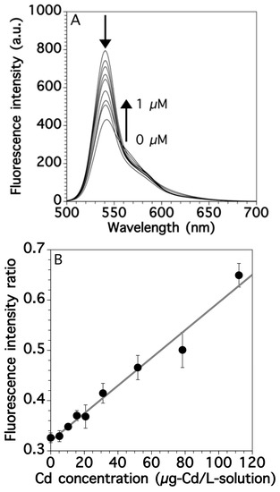 We established a calibration curve for Cd by fluorescence spectroscopy with BDP-TPY. Since the fluorescence spectra of BDP-TPY can be affected by pH value due to the protonation reaction [23], fluorescence titration experiments of BDP-TPY with Cd to generate a calibration curve were carried out in Tris buffer. BDP-TPY had a sharp fluorescence peak at 539 nm and its spectra changed as the Cd concentrations of the standard solutions increased. The height of the original fluorescence peak at 539 nm (F539) gradually decreased then a new fluorescence peak at 562 nm (F562) appeared and increased because of the transfer of intramolecular charges (Figure 6A) [22]. This shift in the spectra allowed the ratiometric measurement of Cd by calculating the fluorescence intensity ratio (F539/F562) [24]. The ratiometric measurement has advantages, such as, independency of results on probe concentration, bleaching, optical path length, illumination intensity, etc. F539/F562 increased linearly with Cd concentrations up to 112 μg-Cd/L-solution (1 μM) (Figure 6B), with the regression equation of y = 0.0027x + 0.32 (R2 = 0.978). The LOD (3s/slope) and limit of quantification (LOQ, 10 s/slope) values for Cd were determined based on the standard deviations of 11 blank solutions. The LOD and LOQ values were estimated to be 3.8 μg-Cd/L-solution (0.03 μM) and 12.7 μg-Cd/L-solution (0.11 μM), respectively. These values were relatively low compared with those of simple analyses previously reported [18,20]. Furthermore, a dynamic range of BDP-TPY was investigated. The linear range of Cd was up to 224 μg-Cd/L-solution (2 μM) (Figure S1 in the Supplementary Material of this paper).