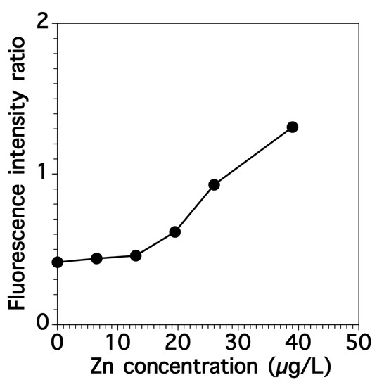We investigated the interfering effect of Zn on Cd determination using fluorescence spectroscopy. Figure 7 shows the relationship between the fluorescence intensity ratio and the Zn concentration while the Cd concentration was kept constant at 33.6 μg-Cd/L-solution (0.3 μM). The ratios gradually increased and an interfering effect was observed at Zn concentrations above 19.5 μg-Zn/L-solution (0.3 μM). Although no Zn was detected in the elution fraction, the Zn concentration should be kept below 19.5 μg-Zn/L-solution when using this method.