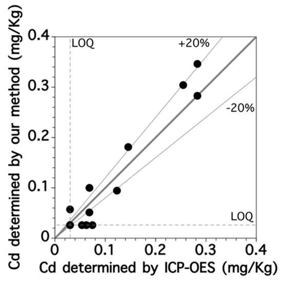 We then investigated the applicability of fluorescence spectroscopy for measuring the Cd content of rice samples both by the standard method using ICP-OES and by our procedure consisting of HCl digestion, column purification and fluorescence spectroscopy. The Cd contents of fifteen brown rice samples were determined using the standard and our methods (Figure 8), revealing an almost linear relationship with a slope of 1.09 and a determination coefficient of 0.964. For most samples, the relative errors in the Cd contents determined by these two methods were within 20%. We thus concluded that Cd contents could be successfully determined in rice samples with complex matrices using our developed procedure. Overall, the actual LOQ value of the Cd content in brown rice was about 0.1 mg-Cd/kg-rice based on the results shown in Figure 8 Since the calibration error exceeded 20% of the calibration span value below 0.1 mg-Cd/kg-rice of Cd contents in brown rice. These values were sufficiently low compared with the regulatory value (0.4 mg-Cd/kg-rice) given by the Codex Alimentarius Commission. Therefore, our method would be suitable for the simple screening of the Cd content in rice samples.