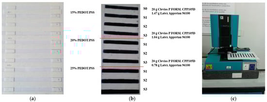 The polymer films for electrical resistance testing were prepared by delivering 500 μL of dispersion(s) by micropipette corresponding to the various content of PEDOT:PSS polymer complex (Table 5) to frames placed on a plexiglass surface (Figure 1). These frames were based on cellulose acetate tracks with dimensions 100 mm × 10 mm (track length × track width, L × l). Three polymer films were realized for each formulation.