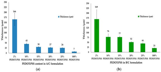 Conductive dry films were realized with different thicknesses ranging from 7 to 166 μm for A/C formulations and from 21 to 169 μm for B/C formulations depending on the content of PEDOT:PSS polymer complex (Figure 2).