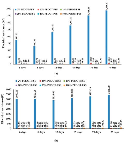 - Electrical resistance of dry films increased with time for 2–25% PEDOT:PSS formulations. There is an insignificant electrical resistance decrease afterwards: