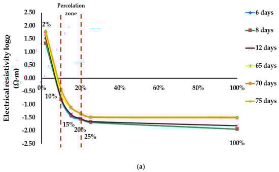The percolation threshold has been determined in the left part of the slope for both aqueous conductive dispersions. In general, there are no mathematical methods to determine the percolation threshold []. In order to determine it properly, the percolation zone has been identified.