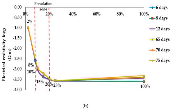 Percolation threshold study of PEDOT:PSS content (%) in a period of 75 days: (a) A/C formulation; (b) B/C formulation.