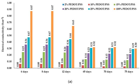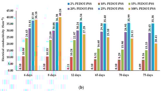 Electrical conductivity (S cm−1) of A/C and B/C dry films in a period of 75 days: (a) A/C dry films; (b) B/C dry films.