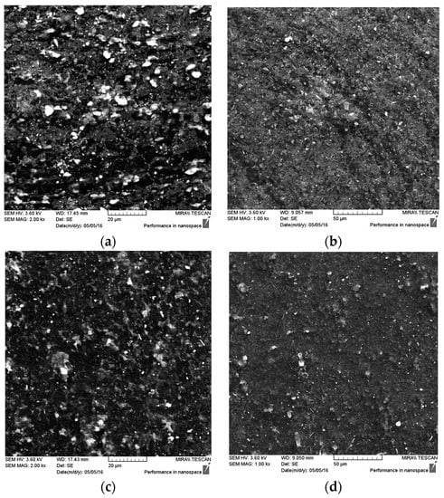 Scanning electron micrographs of conductive dry films, 15% PEDOT:PSS A/C dry film (thickness 94.90 μm) and 8% PEDOT:PSS B/C dry film (thickness 135.67 μm) are presented in Figure 7. Both conductive dry films have granular morphology. The second dry film (Figure 7c,d) shows a more homogeneous surface, justifying its better electrical conductivity. Hence, higher electrical conductivity may be attributed to uniformity of the coating.