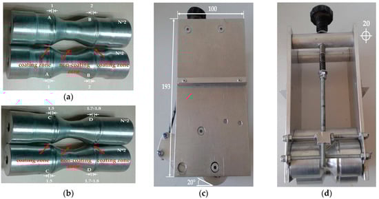 Roll to roll aluminum laboratory device parts: (a) rollers N°2 with notch widths A-A and B-B; (b) rollers N°2 with notch widths C-C and D-D; (c) lateral view and (d) front view.