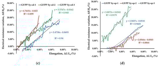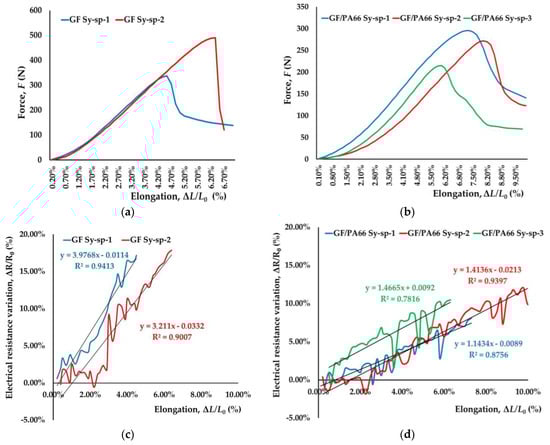 GF/PA66 sensors, GF/PA66 Sy-sp, show higher elongation at break, 7.20%, and lower gauge factor, 1.3412, compared to other textile sensors although number of copper twisted wires applied during their production has to be taken into account. Electrical resistance of GF/PA66 Sy-sp is slightly lower after production compared to other textile sensors, with lower dispersion of results.