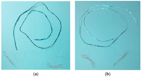 - Copper wires were twisted around conductive coated yarn, 5 rounds in one direction and 2 in the opposite direction, to avoid electrical disturbance due to inductivity and capacity of the connections (Figure A3c), or 3 rounds in one direction (Figure A3d), before the last protective coating and placed at the distance of 5 cm.