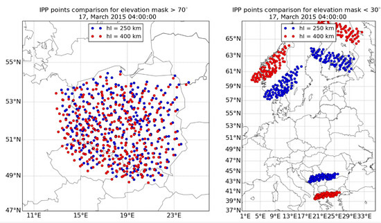 Comparison of ionospheric pierce points (IPPs) distribution for 250 km (blue) and 400 km (red) ionospheric layer heights and for elevation masks >70° (left, one satellite) and <30° (right, three satellites).