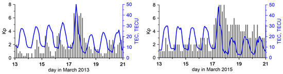 Here, the results obtained for the immediate vicinity of two stormy days are given: 13–20 March 2013 and 13–20 March 2015. For both cases, in Figure 3, the estimated Kp indexes are given [24]. From this Figure, it can be seen that in 2013 the disturbances occurred only on the 17th of March and the Kp index value was near 6. Definitely, higher and longer disturbances were observed in 2015. The geomagnetic storm began on 17 March 2015 and continued until the middle of 19 March 2015. The strongest disturbances occurred, similarly as in 2013, on 17 March 2015. However, their values were much higher and amounted to a maximum Kp of 8.