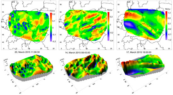 It turns out that TEC irregularities are present at any time and at any geomagnetic activity. They can be divided into at least three categories. In Figure 4, examples of TEC variations’ spatial distribution are shown in the form of maps and 3D-surfaces: random background variations (Figure 4, left), quasi-deterministic wave-like structures (Figure 4, center), and space partitioned ones, which occur during a geomagnetic storm’s active phase (Figure 4, right). Background variations have an autocorrelation function corresponding to a random two-dimensional field. It is possible, however, that the TEC variations shown in Figure 4, left are not entirely random and can correspond to the model presented in the paper [27].