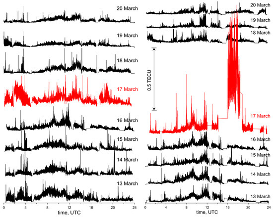 On 17 March 2015, its values between 16 and 19 UTC (Coordinated Universal Time) amounted to more than 1 TECU. For comparison, on the quiet days, the RMS values were below 0.1 TECU for the whole day. From the given results, it can also be seen that the geomagnetic storm in 2013 had a much lower intensity than the one in 2015.