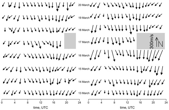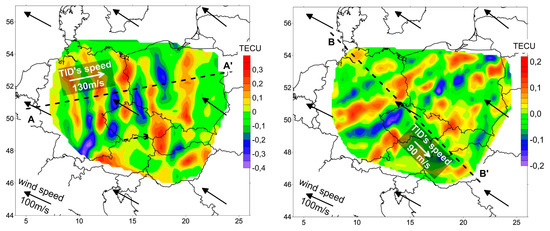 Figure 7 shows black and white arrows. The first of these (black) show the direction and speed of thermospheric wind at the height of the maximum of the F2 ionospheric layer. We have used the horizontal wind model (HWM-07) [29], which is a commonly used model available in the MATLAB software package. The second (white) show the direction and speed of TIDs estimated for the obtained TEC variation models. It can be seen that on 13 March 2013 the speed of ionospheric disturbances was about 130 m/s, with an eastern direction. Similar speed values were calculated for the thermospheric wind from the model, but with an almost opposite direction. In Figure 7, the results from the 2015 year for the same time are shown too. It can be seen that the wind speed has a similar direction and speed as in 2013. However, it can also be noticed that the investigated TID’s speed is smaller, and the direction changes from the east to southeast.