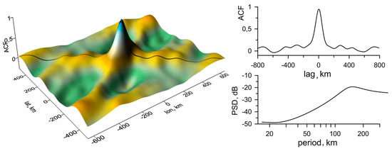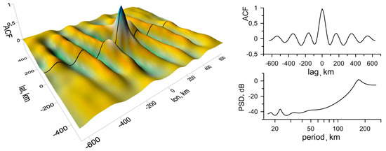 Most of the variable ACFs discussed above are shown in Figure 8 (left) for year 2013 and in Figure 9 (left) for year 2015. The quantitative parameters of a wavy structure are determined in the cross-section (the central profile) of an ACF and in the corresponding power spectral density (PSD) plots in Figure 8 (right) and in Figure 9 (right). In both cases, the modulation periods are estimated to be 170 km. To trace a selected TEC structure’s time history, consecutive maps constructed at one-minute intervals were analyzed during whole time of the TID occurring. The direction of a TID’s propagation (along the lines A-A’ and B-B’, respectively) is orthogonal to the wave front. The phase velocity is determined from the set of cross-sections of the spatial distribution of TEC variations along a certain direction.