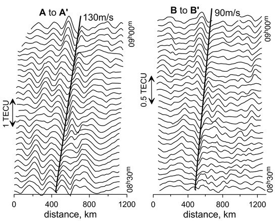The left panel of Figure 10 shows the change in the profile of TEC variations along the A-A’ line in Figure 7, left (from 08h30m to 09h00m on 13 March 2013) in the form of a “waterfall”. Changes in the structure were analyzed on the maps constructed at intervals of one minute. A similar change in the profile of TEC variations is shown in Figure 10, right, for the line B-B’ in Figure 7, right (from 08h30m to 09h00m on 13 March 2015). These figures can be interpreted as a propagation in the ionosphere of the quasi-wave disturbance, which moves eastward at a speed of about 130 m/s (in 2013) and southeastward at a speed of 90 m/s (in 2015). In both cases, these movements in a stable manner are observed for more than half an hour.