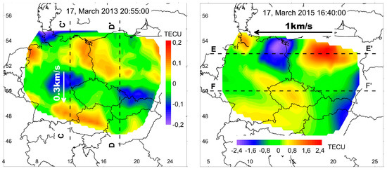 Space partitioned structures, which occurred during the geomagnetic storms' active phase. Maps of TEC variations over investigated region on 17 March 2013 at 20h55m (left) and on 17 March 2015 at 16h40m (right).