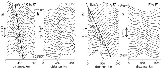 Profiles of TEC variations, in zones with (a, c) as well without (b, d) active travelling disturbances, along the lines C-C’ and D-D’ in Figure 8 left on 17 March 2013 (a, b) and along the lines E-E’ and F-F’ in Figure 8 right on 17 March 2015 (c, d), in the form of a “waterfall”. The bold lines show the trajectory of the disturbances.